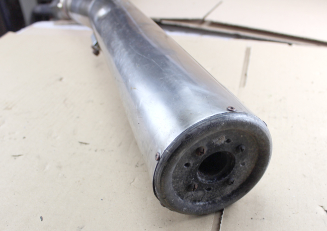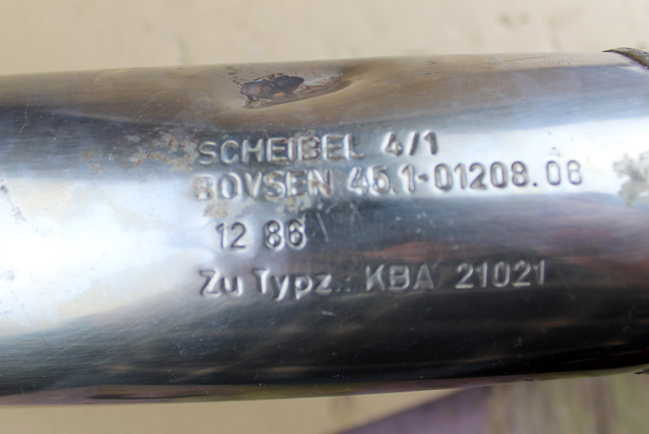 Gebrauchter Auspuff von Scheibel für Honda CB750Four. Aussen nicht mehr schön und teilweise mit Roststellen, aber nur äusserlich, innen rappelt nichts. Mit Beule oberhalb der "Scheibel"-Stanzung. Stanzung im Endtopf: Scheibel 4/1, BOVSEN 45.1 - 01208.06, 12/86, Zu Typz.: KBA 21021.
